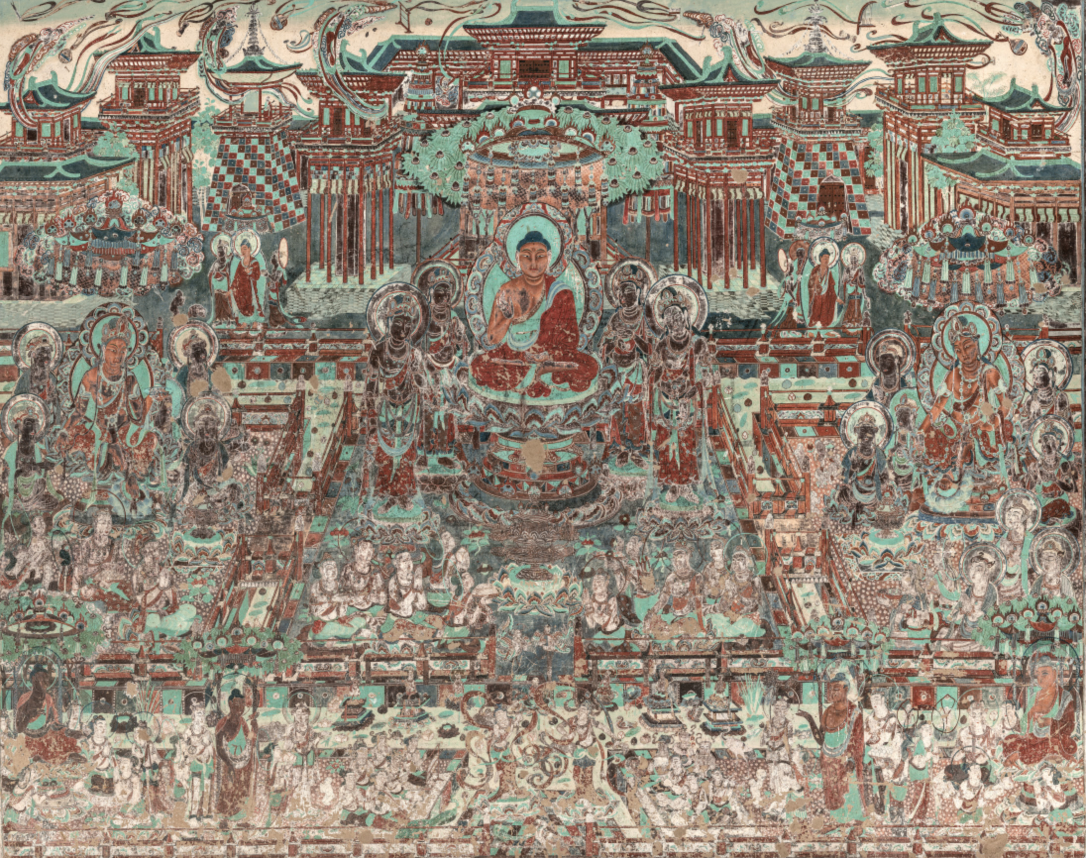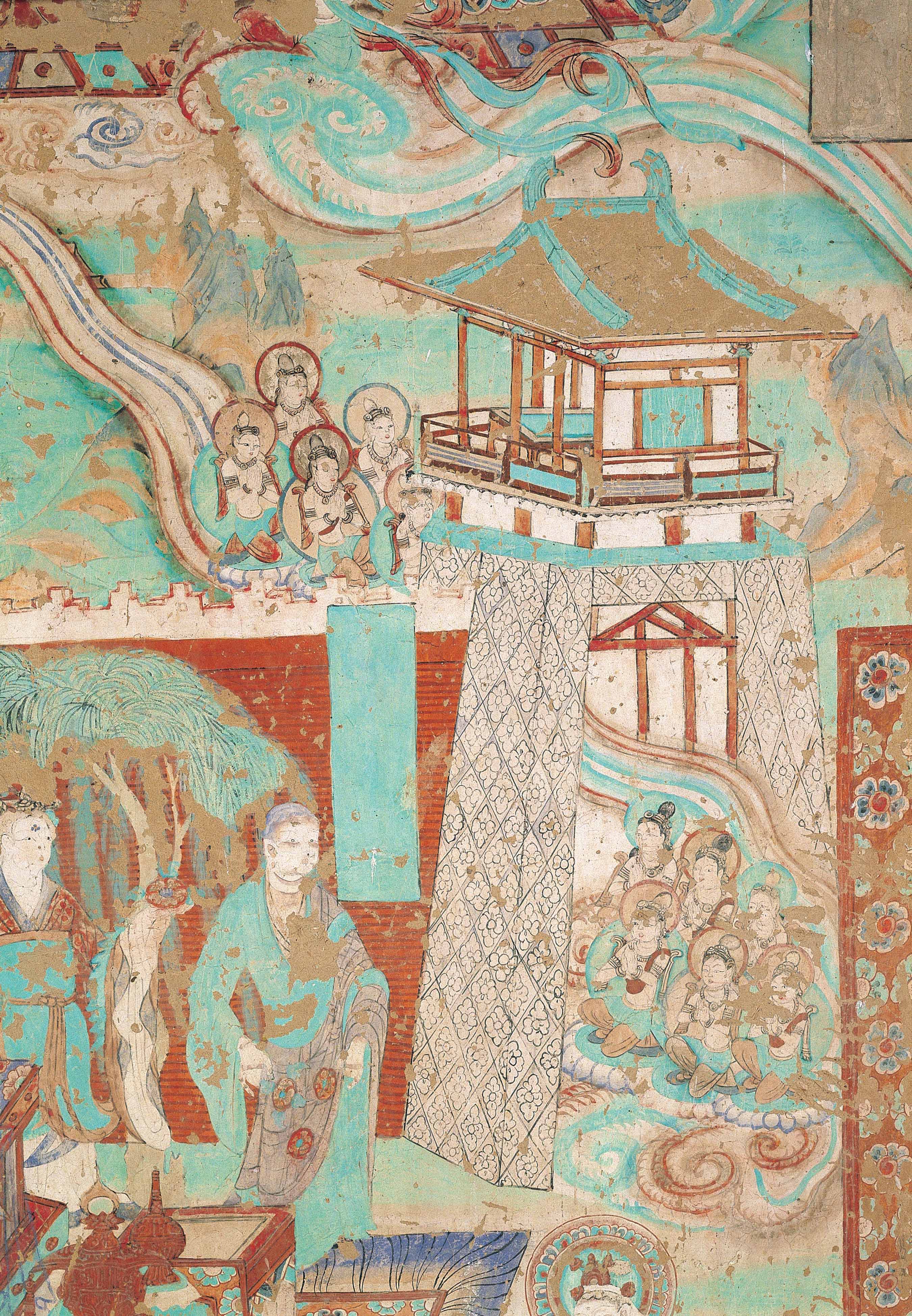 敦煌石窟遗存着公元4-14世纪一千年间的历代壁画,总面积4.5万多平方米,规模巨大,内容丰富,尤其是建筑和山水环境常用作经变画和各种故事画的背景。敦煌壁画中反映的古代建筑与园林形象在历史中累积出不言之美,映射着人类对于礼仪制度、宗教理念、审美意趣等等传统。