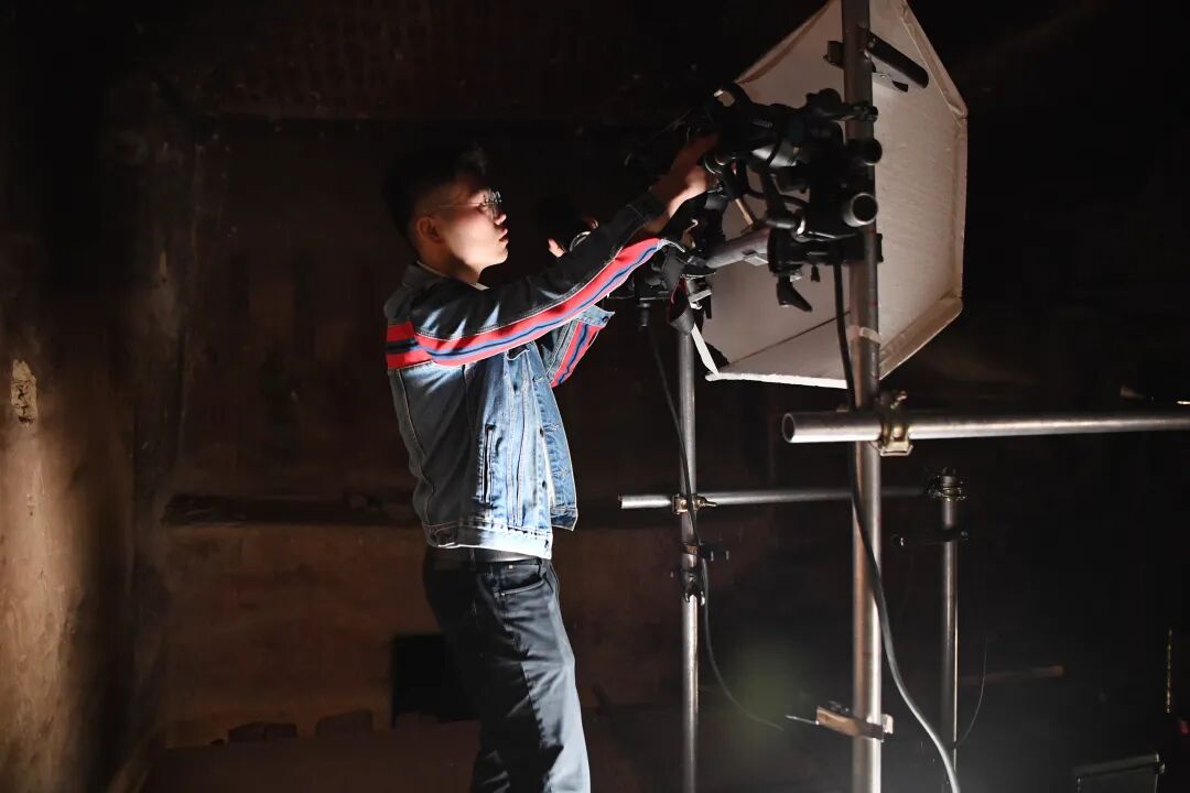 敦煌研究院文物数字化保护团队图像采集人员在洞窟内调试设备,准备进行壁画图像采集 陈斌 摄