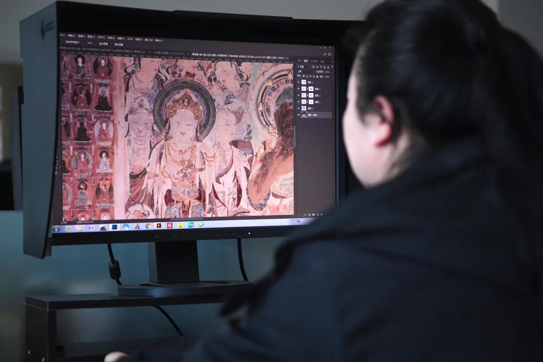 敦煌研究院文物数字化保护团队图像处理人员在拼接壁画图像 陈斌 摄