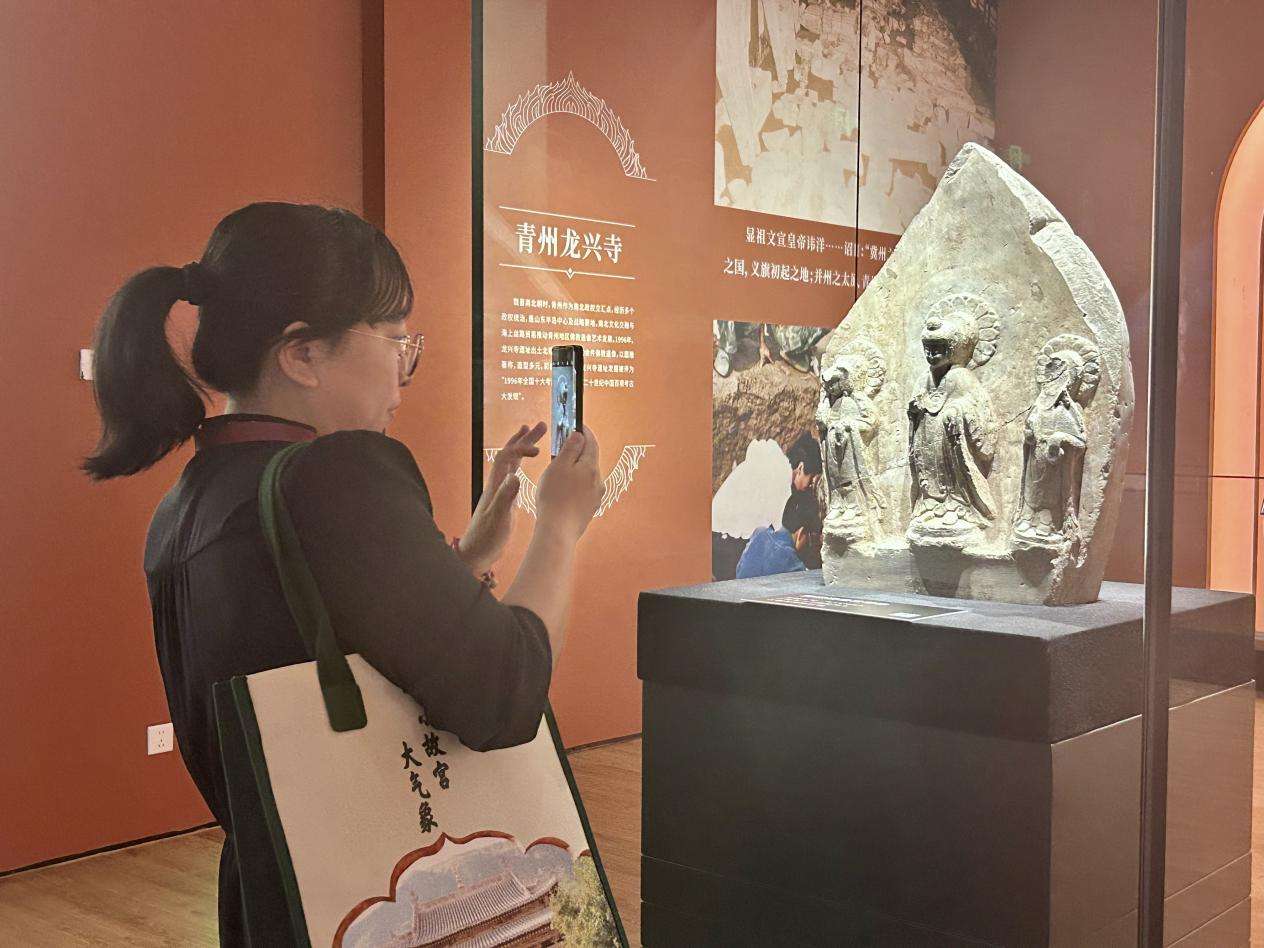 “这次我们带来一件背屏式三尊像和两件单体佛像,是青州龙兴寺遗址出土的典型代表。”青州市博物馆馆长曾磊介绍,青州在魏晋南北朝时是南北政权交汇点,龙兴寺遗址在1996年曾出土600余尊佛教造像,以圆雕著称,融合南北和中西艺术。特别是雕像上轻薄叠褶服饰的造型,形成了极具地方特色的“青州模式”。