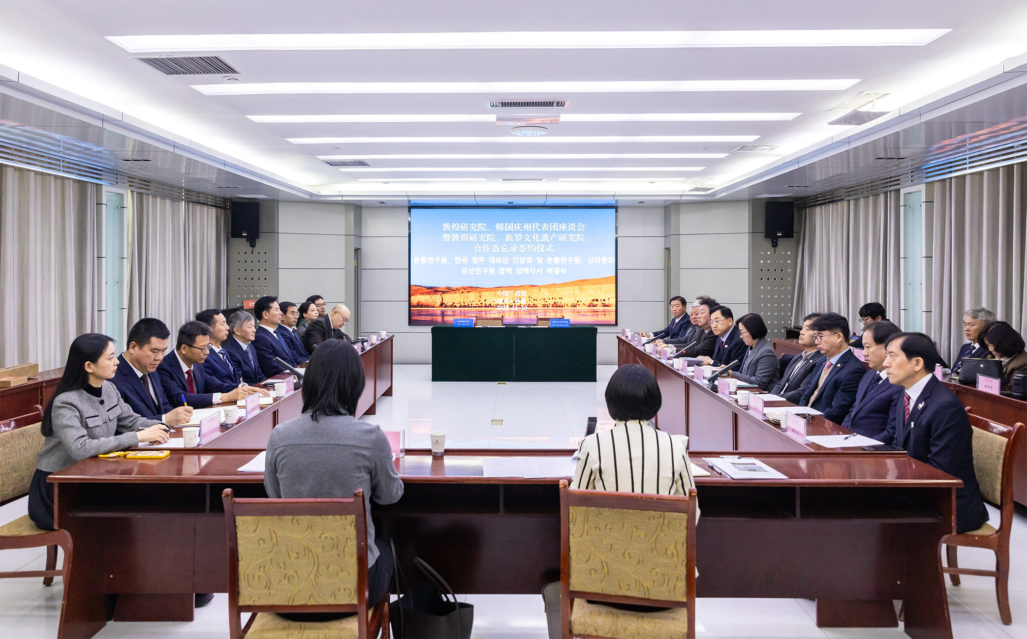 11月19日,敦煌研究院与韩国庆州代表团座谈会暨敦煌研究院与韩国新罗文化遗产研究院合作备忘录签约仪式在敦煌研究院举行。