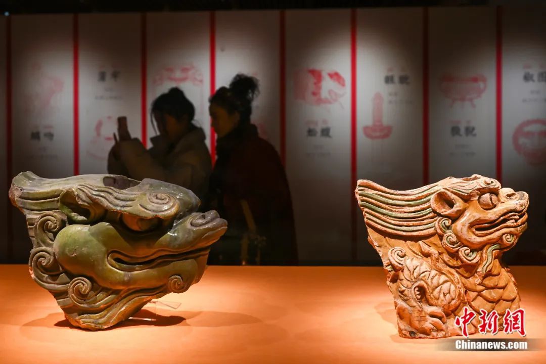 2024年1月,在南京市博物馆展出的明代龙纹琉璃构件(右)、绿釉龙纹琉璃构件。泱波 摄