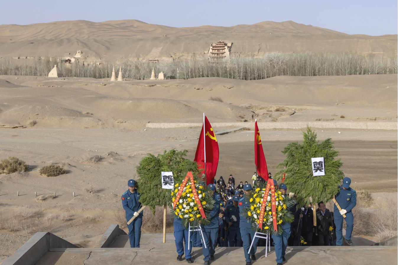 今年是中华人民共和国成立75周年,是敦煌研究院建院80周年。为传承弘扬“莫高精神”,缅怀和祭奠为敦煌文物事业作出突出贡献的先辈们,4月3日上午,敦煌研究院组织400余名干部职工在莫高窟公墓区举行了清明祭扫活动。敦煌研究院名誉院长樊锦诗,党委委员、副院长郭青林,党委委员、纪委书记王建党参加了此次活动。