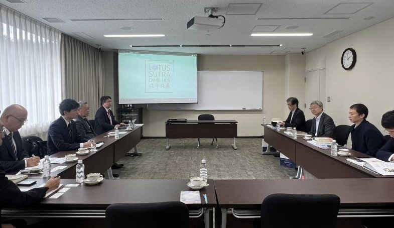 2024年10月30日,敦煌研究院党委书记赵声良一行应邀访问了位于日本东京都八王子市的东洋哲学研究所,东洋哲学研究所所长田中亮平简要介绍了该所的情况,对赵声良书记一行的到来表示欢迎。该所研究员茑木荣一介绍了由东洋哲学研究所主办的“法华经——和平与共生的启示”展览十多年来在世界各国展出的情况,对敦煌研究院对展览的支持表示感谢。“法华经——和平与共生的启示”展览最早是2006年开始举办的,最初就得到敦煌研究院的支持,2017年新加坡展,敦煌研究院就作为共同主办者一同推动展览。2018年,双方正式签订学术交流协议,同年9月在敦煌研究院共同举办了“敦煌与法华经”研讨会,自此双方学术互动与文化交流日益密切。