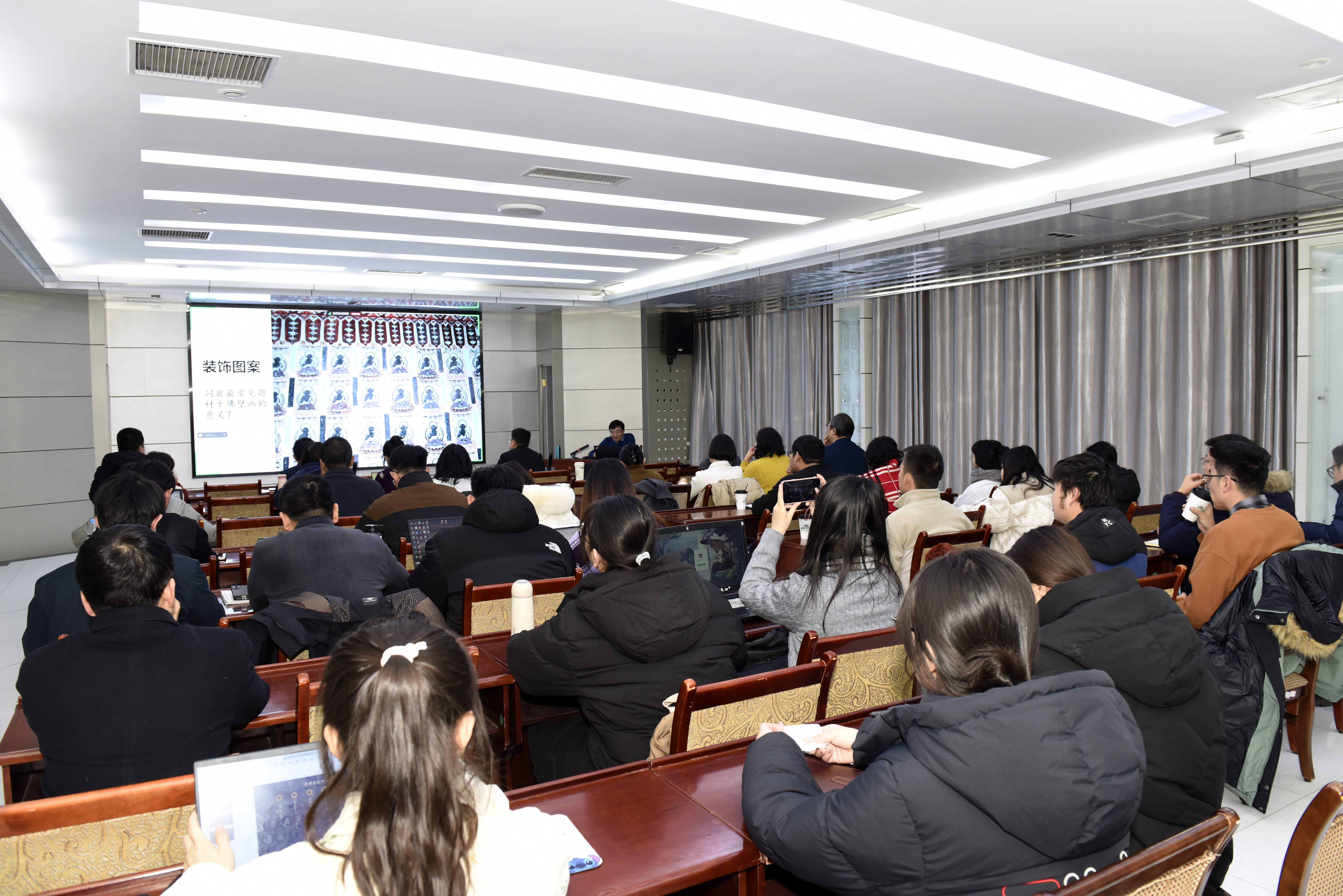 1月15日上午,“我在敦煌读壁画”第19期分享会在敦煌研究院举办,陕西师范大学教授沙武田作了题为《窟里拾珠:在石窟中问学》的讲座,分享会由敦煌学信息中心主任宋焰朋主持。沙武田从敦煌壁画中的联珠纹谈起,就洞窟内容研究、研究兴趣挖掘和团队建设等几方面做了分享。敦煌研究院副院长张小刚研究馆员首先感谢了沙武田教授对青年学者的培养,强调了团队建设对敦煌学研究高地建设的重要意义,并希望今后能继续加强合作,共同推动敦煌石窟的深入研究。