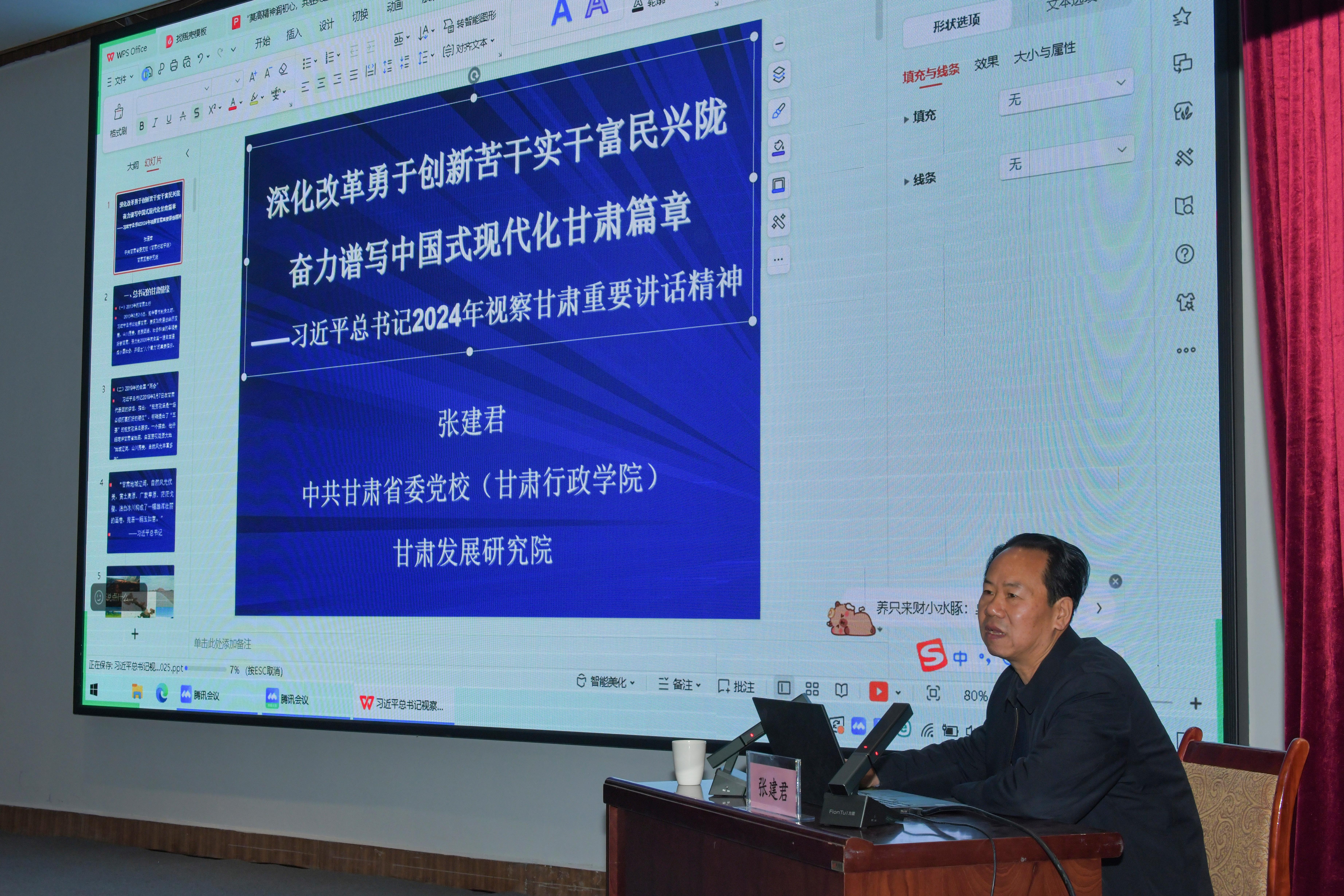 甘肃省委党校甘肃发展研究院院长张建君作《深入学习宣传贯彻党的二十届三中全会精神和习近平总书记视察甘肃重要讲话和指示批示精神》专题讲座。授课围绕中国式现代化、全面深化改革,习近平总书记三次视察甘肃等主要内容,从全省文旅行业发展实际出发,就如何更好地学习贯彻党的二十届三中全会精神和习近平总书记视察甘肃重要讲话重要指示精神进行了系统阐释和解读。