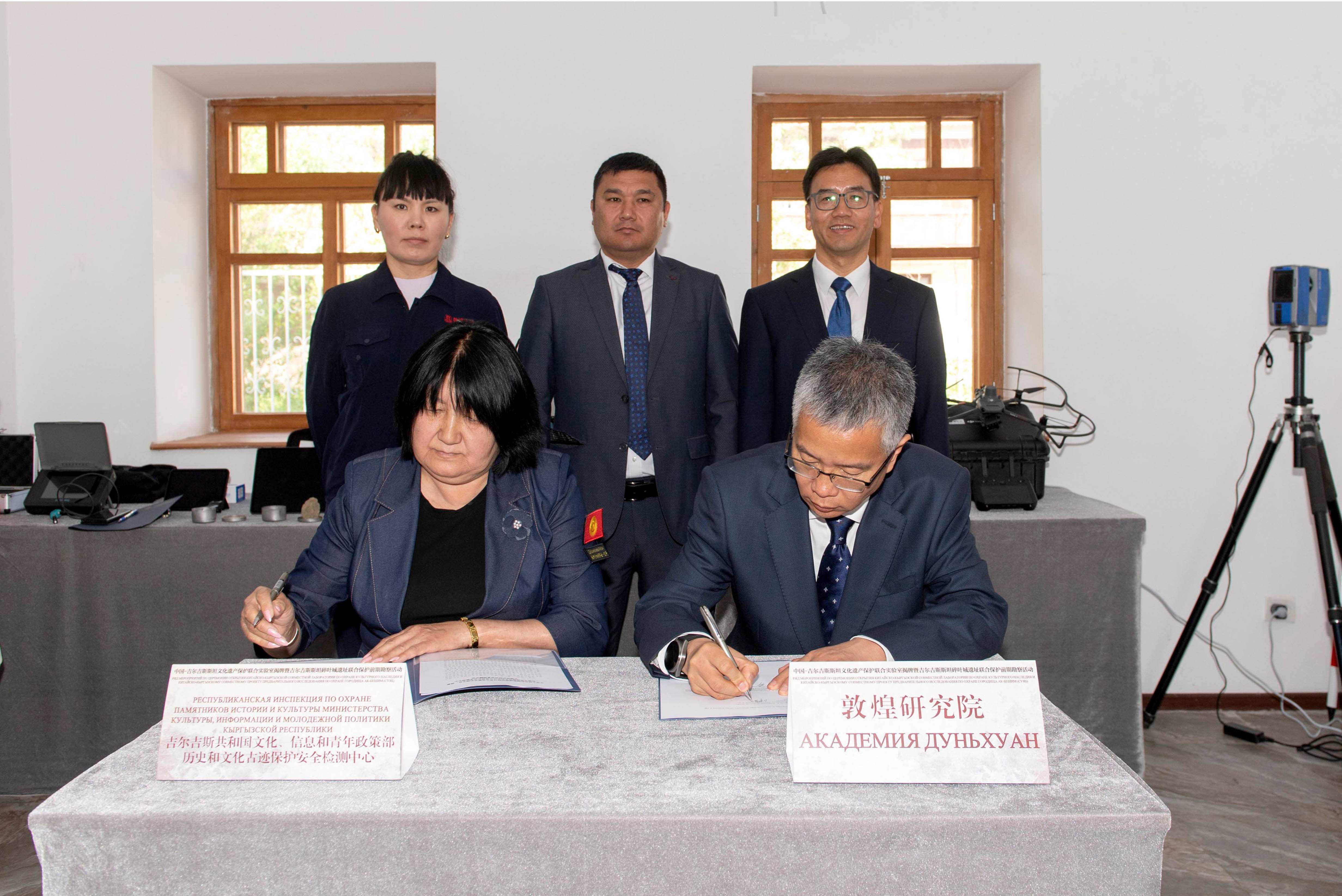 吉尔吉斯共和国文化、信息和青年政策部历史和文化古迹保护安全检测中心主任杜伊沙纳利耶娃·艾辛,敦煌研究院党委副书记郭青林代表双方签字确认捐赠设备清单并签署《文物保护研究设备捐赠协议》。