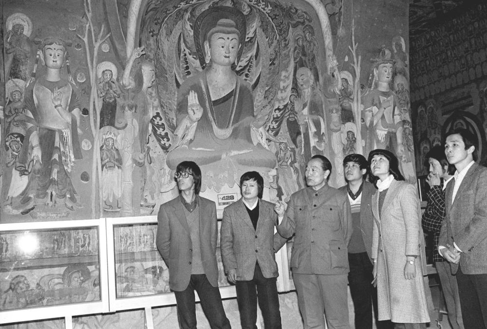 1987年,时任敦煌研究院院长段文杰(左三)向年轻大学生介绍敦煌石窟壁画艺术。 新华社记者 张生贵 摄