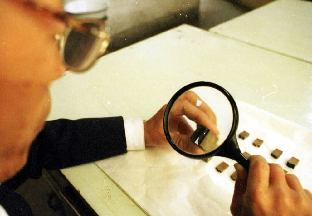 2004年,敦煌莫高窟考古专家对北区出土的木活字进行鉴定研究。 新华社记者梁强摄