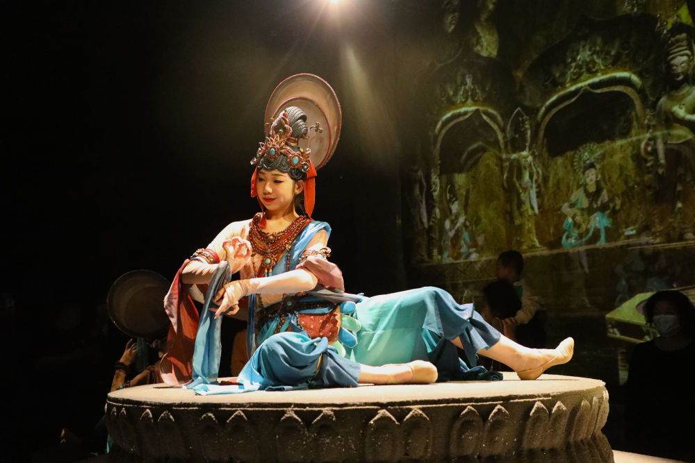 2023年6月3日,在甘肃省酒泉市敦煌市乐动敦煌剧场,大型洞窟式沉浸体验剧《乐动敦煌》的演员在演出。新华社记者 张智敏 摄