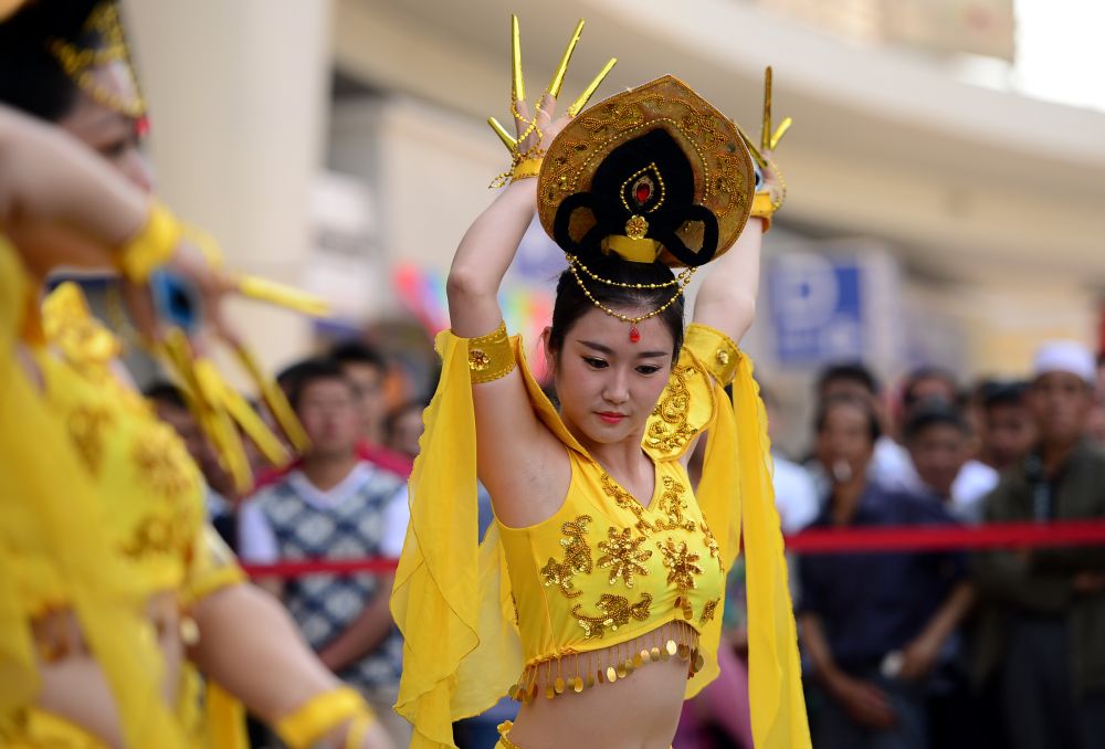 2014年7月4日,在兰州火车站,兰州火车站客运员在表演敦煌“飞天”舞蹈。新华社记者 张锰 摄