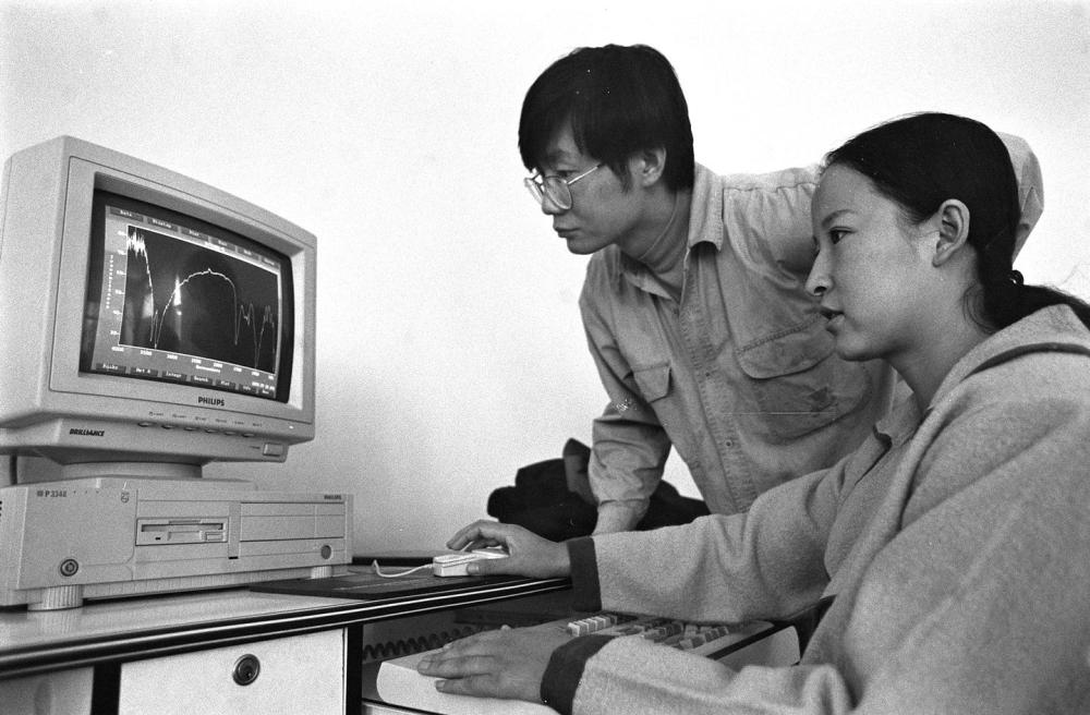 1996年,研究人员使用红外光谱技术分析莫高窟壁画颜料的白、红、蓝等五种颜料的组成成份及变色颜料的成份。 新华社记者 彭张青 摄