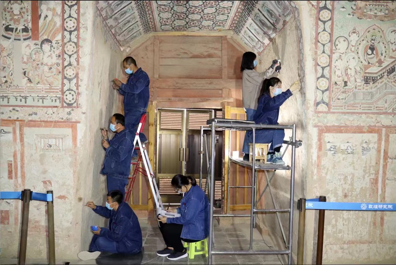 莫高窟夏季有季节性降雨,雨水溶解了岩体中的盐分,最终会导致壁画出现空鼓、起甲、酥碱等病害。壁画修复是一项复杂且极具科学性的工作。20世纪90年代,研究团队与外国专家一起,历时7年、尝试了81种配方,终于找到了合适的壁画空鼓灌浆材料,研发出壁画保护关键技术。如今,敦煌研究院已经拥有完整的壁画修复研究、设计、施工团队,形成了产学研用全链条的壁画保护模式,使修复工作极具成效,也让敦煌的壁画保护技术成功跻身国际“第一梯队”。