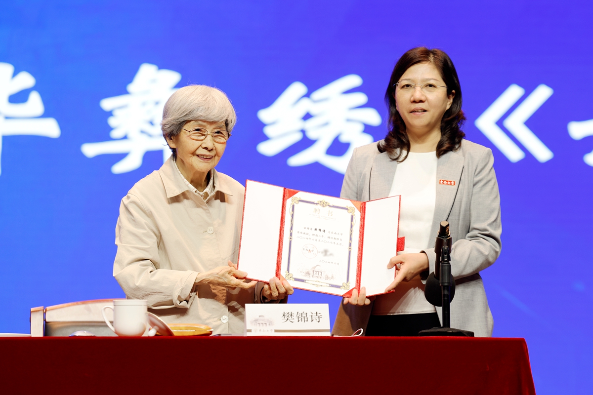 黄如代表东南大学为樊锦诗颁发东南大学荣誉教授聘书、佩戴东南大学校徽,并赠送学校文化纪念品——南华彝绣《六朝松》。樊锦诗向东南大学赠送著作《敦煌石窟全集》第一卷《莫高窟第266~275窟考古报告》、第二卷《莫高窟第256、257、259窟考古报告》。