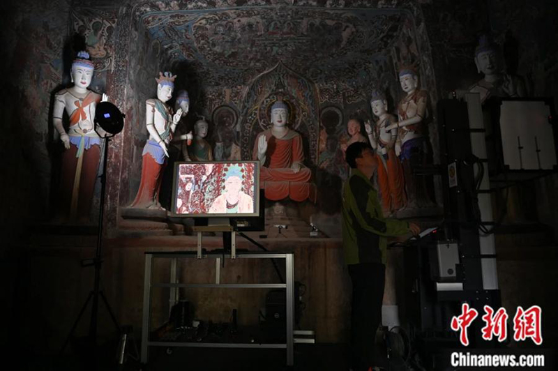 2024年6月,甘肃敦煌莫高窟内,敦煌研究院文物数字化研究所工作人员进行敦煌壁画数字化采集工作。李亚龙 摄