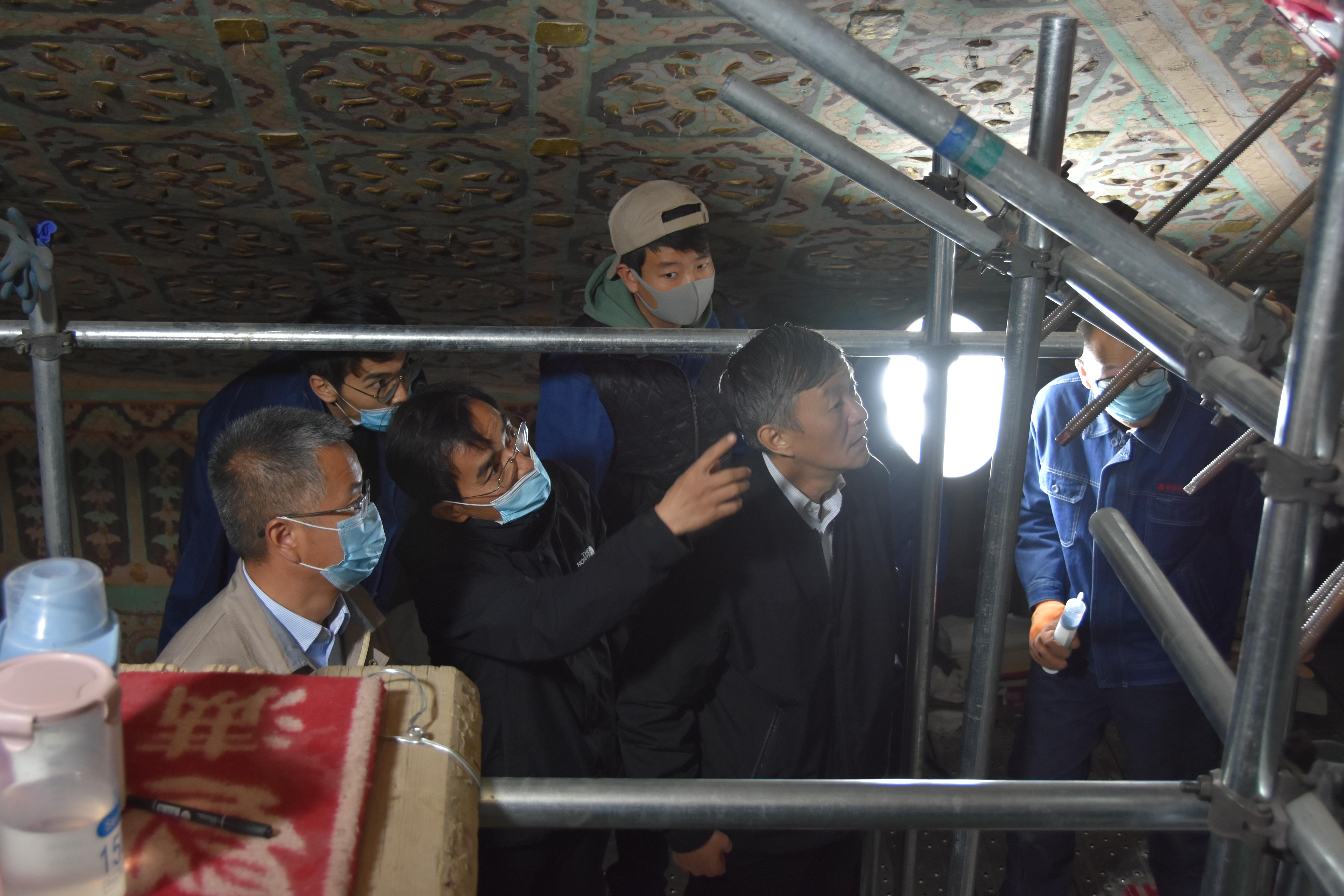 敦煌研究院院长苏伯民(前排左三)和团队成员在莫高窟第130窟保护现场讨论交流。敦煌研究院供图