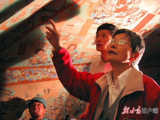 樊锦诗在莫高窟第85窟壁画修复现场检查工作。