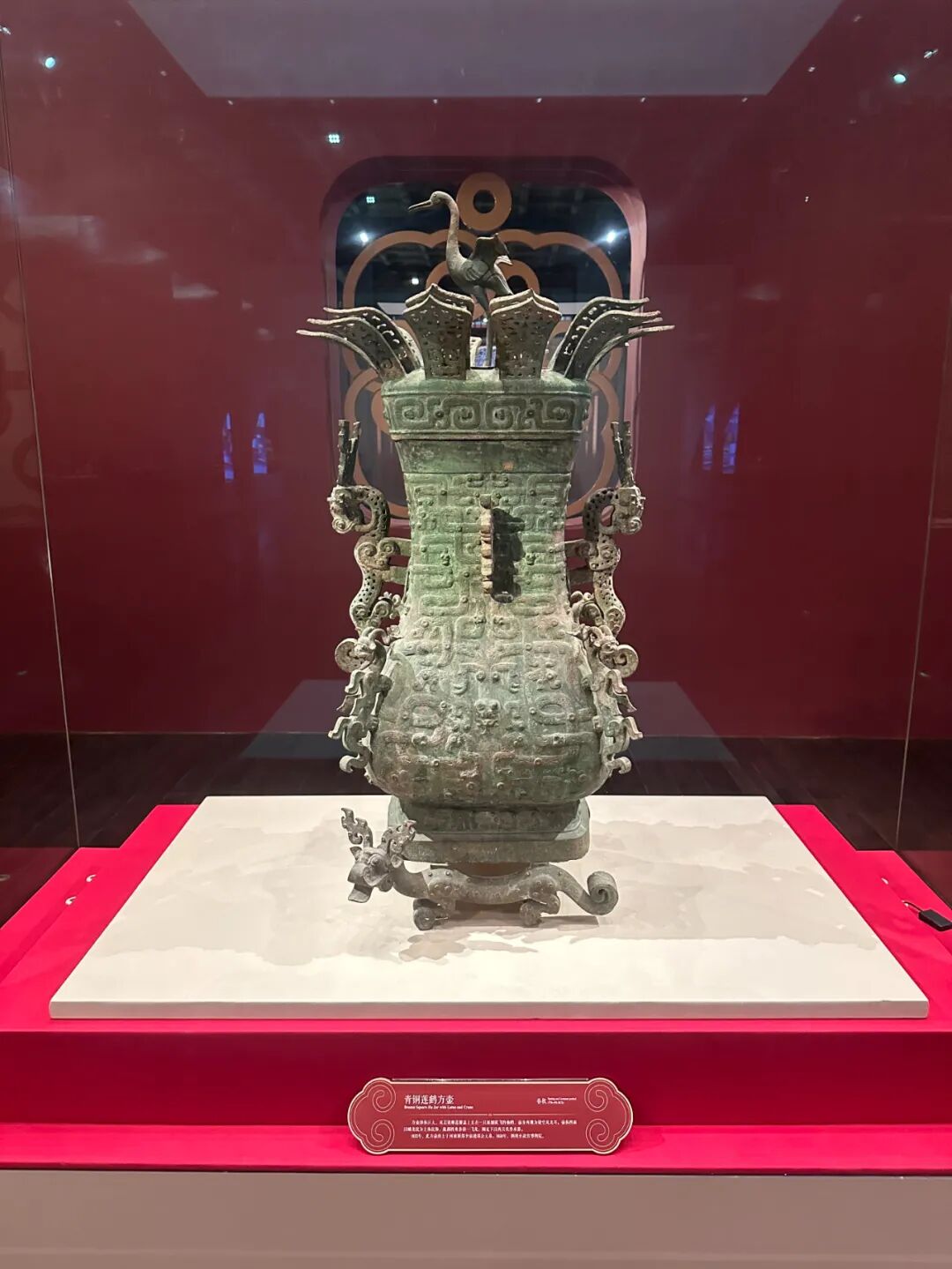 故宫展出的青铜莲鹤方壶。(中央广播电视总台央视记者朱超拍摄)