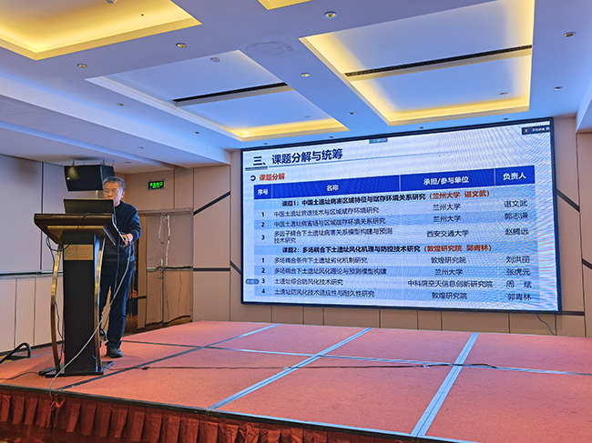 在内部讨论会环节,项目负责人郭青林研究员汇报了项目实施方案,课题一负责人兰州大学谌文武教授、课题二负责人敦煌研究院郭青林研究员、课题三负责人敦煌研究院杨善龙副研究员、课题四课题联系人机械工业仪器仪表综合技术经济研究所科研处副处长安程高级工程师、课题五负责人西北大学孙满利教授分别汇报了5个课题的实施方案,与会人员对实施方案进行了深入讨论,形成了系列修改意见、实施衔接细节及注意事项。