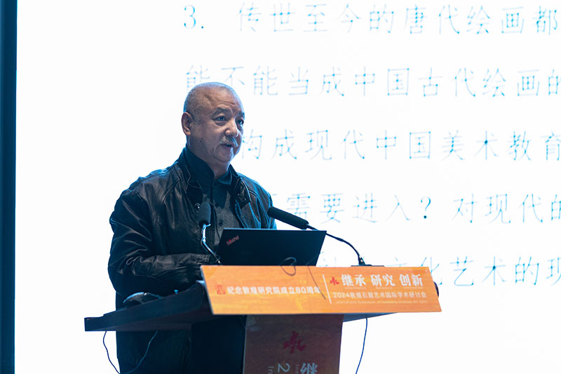 开幕式后,甘肃省雕塑研究院研究馆员何鄂,北京大学教授朱青生,东京艺术大学教授荒井经,敦煌研究院研究馆员赵声良,斯坦福大学讲席教授谢晓泽,中央美术学院教授王颖生,北京服装学院教授刘元风,日本京都市立艺术大学名誉教授浅野均,广州美术学院教授王见,先后以《致敬先辈巨匠 赓续时代华章——敦煌十二载一朝顿悟 中华文明精髓源创造》《敦煌壁画在世界艺术史中的地位》《日本壁画临摹及西域画临摹的进程——以东京艺术大学藏品为中心》《敦煌壁画与盛唐气象》《历史的琥珀:敦煌藏经洞再想象》《摹写的传承与发展》《敦煌服饰图像整理及创新设计应用》《从敦煌壁画的山岳表现看观察方式的发展》《造就“中国名画”,成就“世界名画”——再论研究254窟〈舍生饲虎图〉等三幅壁画的典范意义》为题作了精彩报告。