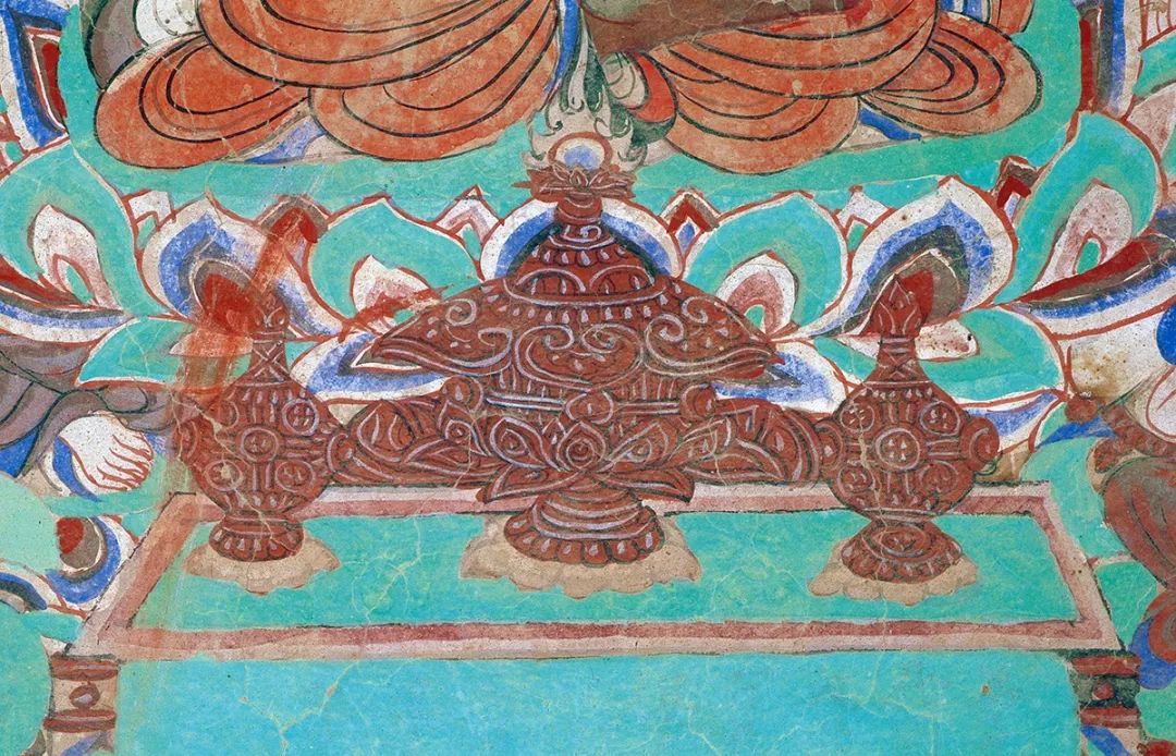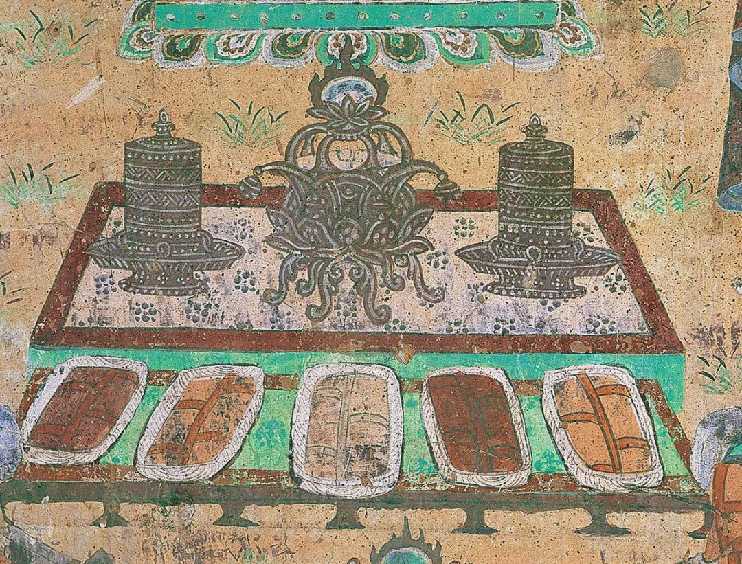 莫高窟第445窟北壁所绘的曲腿香炉尤为特殊——唐代出土的香炉多见三足或五足,这只绘于盛唐的香炉则有六足,在壁画和出土文物中极为少见。