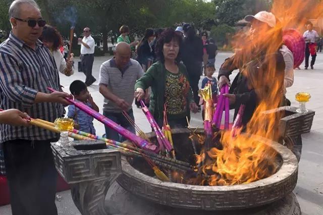 在九层楼前,他们烧香礼佛,祈求幸福,直至中午,人群仍未散去。