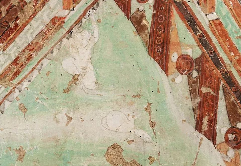 “斗四莲池童子,作游戏状”。出现在莫高窟北魏第257窟窟顶后部平棋东南角的画面,向我们描绘了莲池中游泳嬉戏的场景。
