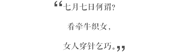这一天,牛郎织女相会,怀春少女们轻提裙边踏上彩楼,奔逐栏边对着银河望眼欲穿,等待牵牛渡银汉;她们趁着月光穿针乞巧,将五色丝线快速从连排九孔针中贯穿而得巧。