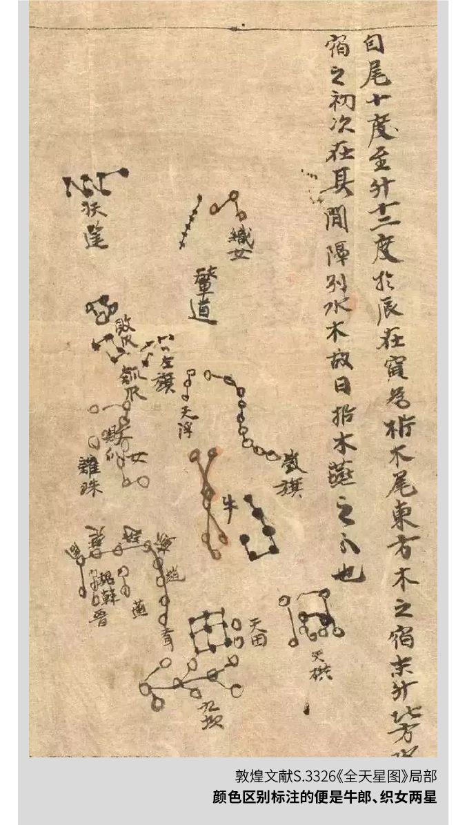 敦煌藏经洞出土的《全天星图》(又称《敦煌星图甲本》斯坦因编号为S.3326,现藏于大英博物馆)囊括了当时北半球肉眼可见的大部分恒星,是现存记载星数最多(1359颗)、时代最古老的一幅星图,牛郎、织女星便在其中。