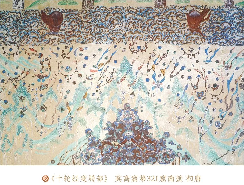 莫高窟盛唐第321窟《十轮经变》,说法会上方云涛翻滚横贯天空,鲜花、璎珞、乐器、宝瓶如雨水般飞舞落下。这场大雨展示的是地藏菩萨自南方净土世界而来时的“出场特效”,古人对充满珍宝的美妙世间的想象瞬间即现。