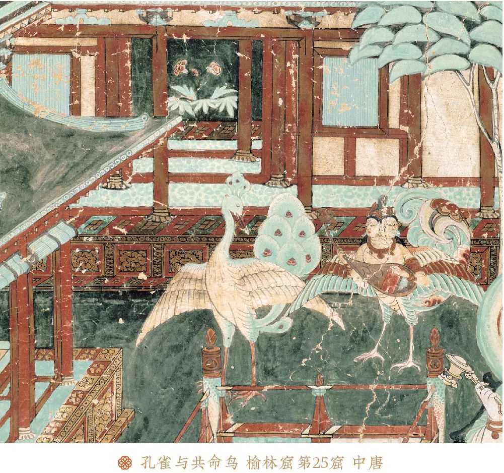 共命鸟弹奏凤首琴,孔雀振翅起舞。
