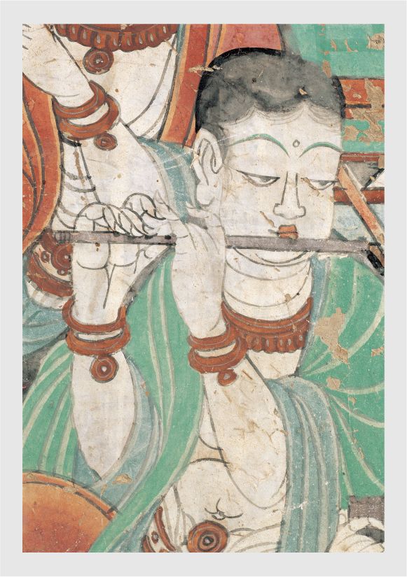 在莫高窟第112窟这场盛大的乐舞图中,吹笛的乐伎神态祥和,眉目低垂,望向下方。手中的玉笛更是逼真细致,连吹孔和按孔都清晰可见,玉笛清透明亮,想必是上好的材质吧!