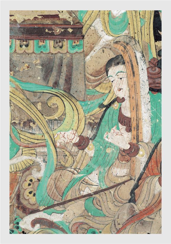 琵琶通身呈梨形,线条流畅优美,像一滴眼泪,从飞天乐伎低垂的眼帘中滑落。乐伎手持琵琶,只消轻轻拨动琴弦,万般情愫瞬间涌现上来。