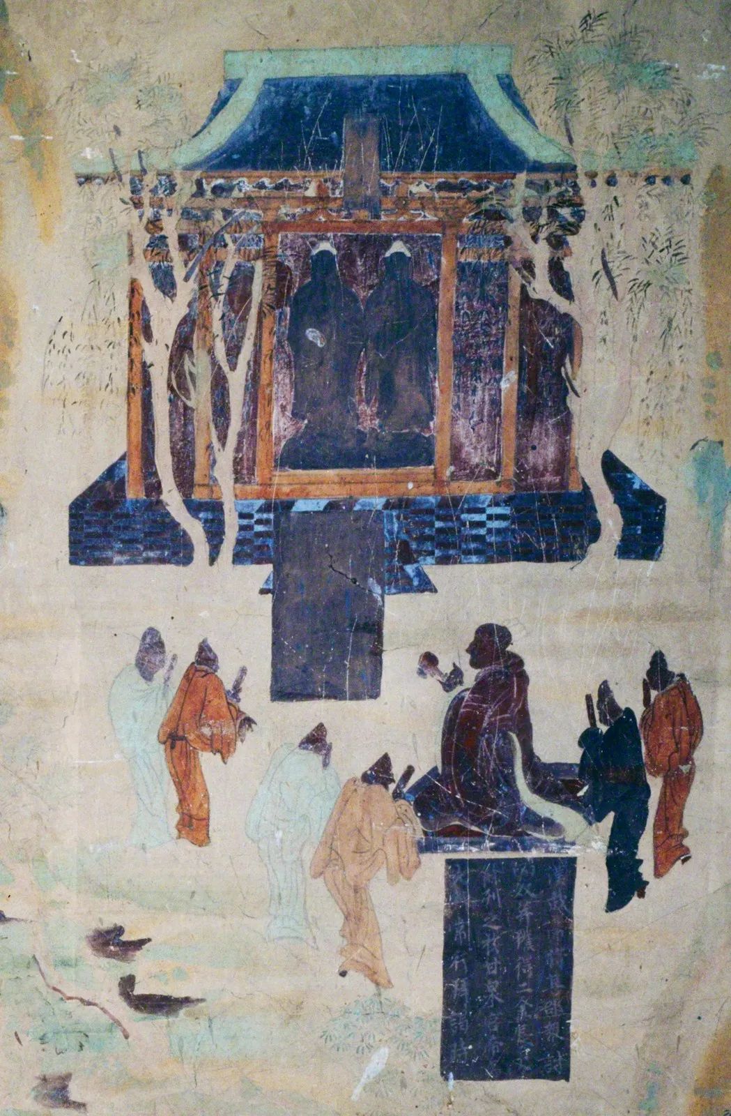 居于下方的第二幅画面是故事的主体,画中一位帝王骑着高头大马,身后一干侍从僚属。帝王的对面,持笏板跪拜者就是张骞。他们之间的榜题写着:“前汉中宗既获金人莫知名号,乃使博望侯张骞往西域大夏国问名号时。”如果说获得金人之后张骞又去了趟西域,那画中所绘应是张骞第二次出使西域。