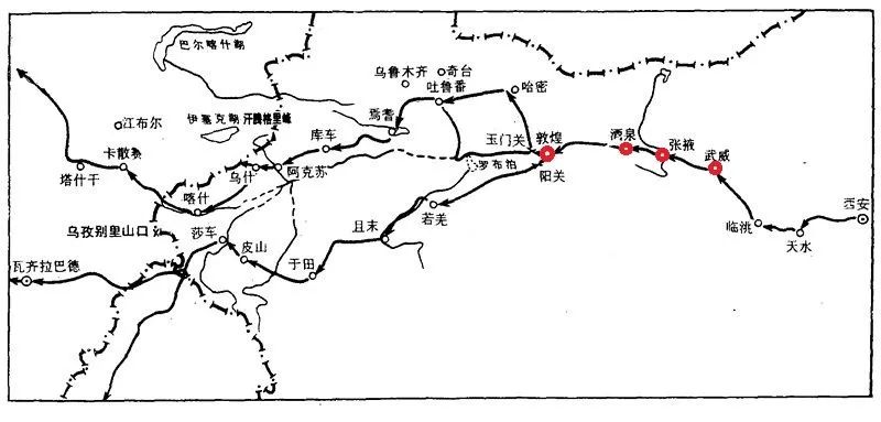 就在这一年,大汉王朝设置了武威、酒泉二郡,敦煌地区归酒泉郡管辖。元鼎六年(前111),分武威、酒泉两郡之地,设张掖、敦煌二郡。并在此时将长城从酒泉修筑到敦煌以西,于敦煌郡城的西面分设玉门关和阳关,扼守从西域进入河西和中原的大门,完成了“列四郡,据两关”之势。河西走廊是丝路的主干道,四郡的设置保证了东西方交通的安全,最西端的敦煌也从此成为丝路的要冲。