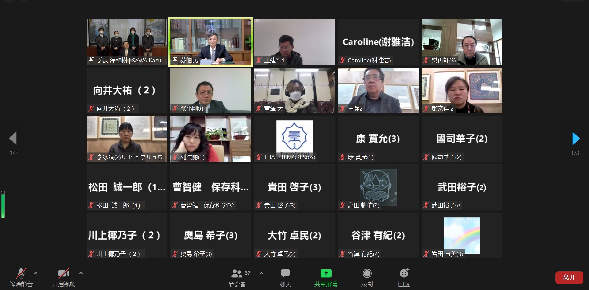 泽和树在交流会上致辞。他表示,敦煌研究院和东京艺术大学的交流合作在中国和日本的文化交流史上持续多年,今天通过线上方式共同展望,期盼疫情之后重启新的交流篇章。期盼能早日再次迎接敦煌研究院日夜保护世界文化遗产的研究者们到东京艺术大学访问研习,同时也希望早日能派东京艺术大学师生到敦煌学习。衷心祝贺敦煌研究院不断取得发展。