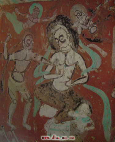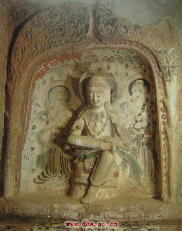 南壁上部的双树圆拱龛则来源于西域或印度,仍是表现菩萨在树下静思的情景。此处颜色经宋代重涂,但人物整体形象仍突显原貌,带有较为浓厚的西域风骨。龛侧对称两树,树干塑的较为真实,有树木纹理,而上部的处理又较为图案化,看起来枝繁叶茂,又不显得纷乱。树下菩萨,坐于高座,左脚着地,右腿曲置左膝之上,左手抚右脚。右臂残损,但仍可看出原应是拄头思惟之状。菩萨面部浑圆,神态自然,似已陷入沉思不能自拔,颈部与胸前的璎珞厚重,带有西域王者的装饰特征。佛教早期的菩萨装多取自西域和印度的王族衣着装饰,于此可见。