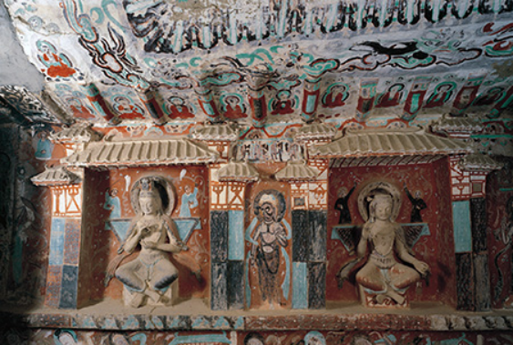 南北两壁上部的阙形龛是中国传统建筑的象征。阙,常见于中国古代标志性建筑群前两侧,所谓“阙者缺也,中间阙然为道”。阙是一种带有观望与军事作用,与“观”类似的建筑。阙形龛是在两龛之间加上殿顶,来代表天上的宫阙,借以表现佛教天宫的样式。龛中塑菩萨,或交脚,或思惟,他们都应属于“补处菩萨”,即佛的候补,降世之前均在考虑将来如何成佛的问题。