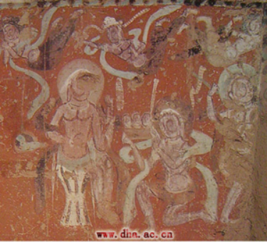壁画中太子遇老人与出家人两情节保存较好,均是太子骑马从城门中出,前有伎乐弹箜篌、琵琶引导,下有侍从百姓礼拜,上有飞天散花相迎。图中右侧情节为遇老人,老人发、眉、须皆白,面容憔悴,弯腰弓背,老态龙钟,仅着短裤,似正在向太子行礼。左侧为遇僧人之情节,僧人着右袒袈裟,面容饱满,姿态自然潇洒,左手握袈裟,其健康超脱与老人形成鲜明对比。