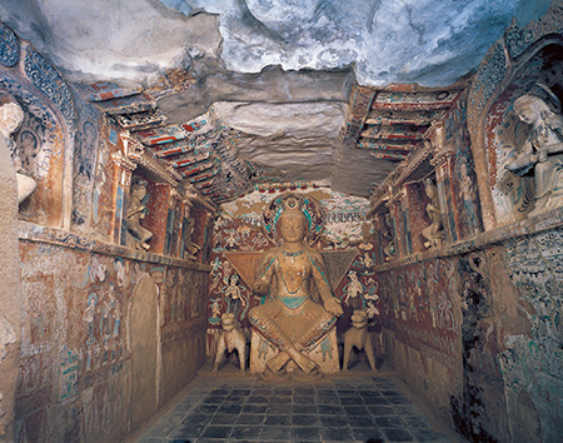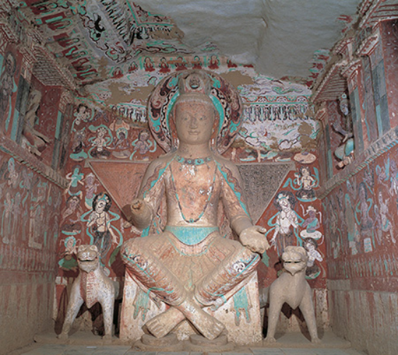 此窟主尊,位于西壁中央,保存基本完好,唯头部略有重妆,双手残损。此塑像高3.34米,头戴化佛三珠宝冠,发披两肩,右手置膝作与愿印,左手已残,颈饰贴花镶宝的项圈及璎珞,上身袒裸,胸挂璎珞,肩披大巾,腰束翻边羊肠大裙,衣褶贴泥条隆起,加阴刻衣纹线。菩萨面相浑圆而略长,隆鼻直通额际,眉长圆眼,上唇较厚,下唇作半圆状,肩宽胸平,体态健硕,双足相交,身靠三角形靠背,端坐在比较高大的方形双狮座上,神情庄重凝静,威严肃穆,造型概括稳定,比例均称,色彩明快单纯,手法简朴。其造型风格及坐具、服饰均表现出西域佛教艺术的影响,具有十六国时期造像的显著特点。