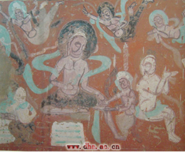 虔阇尼婆梨王剜身燃千灯,故事讲:虔阇尼婆梨王为人正直,喜好正法,向全国发布命令寻求能讲说正法之人。劳度叉应召愿为其说一偈语,但要求国王必须在自己身上剜一千个洞点燃千灯。大臣属民都劝国王不要这样做,国王却毫无惧色,为听闻法语果然身燃千灯。佛教护法神帝释天被其诚心感动,最后使国王身体恢复如前。壁画略有残损,国王端坐,上有飞天散花,前有一人正在剜凿国王的身体,坐下一人正恐惧的看着眼前发生的一切。
