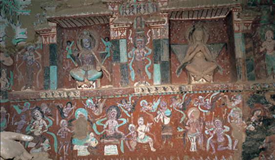 毗楞竭梨王身钉千钉,故事讲:毗楞竭梨王喜好妙法。有一个叫劳度叉的婆罗门,称如果有人愿意在自己身上钉一千个钉子,他就为那人说法。毗楞竭梨王知道后非常高兴,请劳度叉说法,并任劳度叉在自己身上钉钉子。图中劳度叉一手执钉、一手挥锤,正向毗楞竭梨王身上钉钉。国王神态安祥,似乎正沉浸在听闻法语的喜悦当中,完全忘记身钉千钉的痛苦。