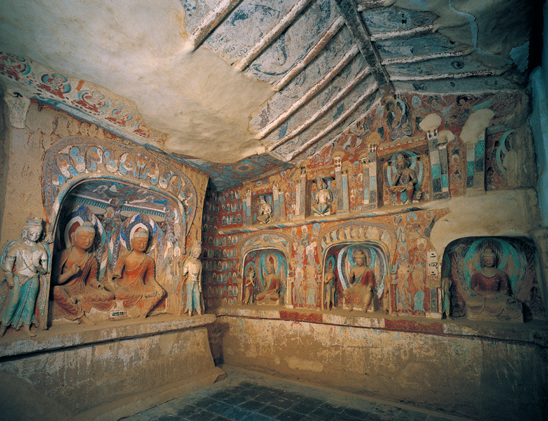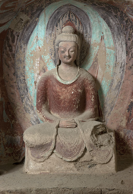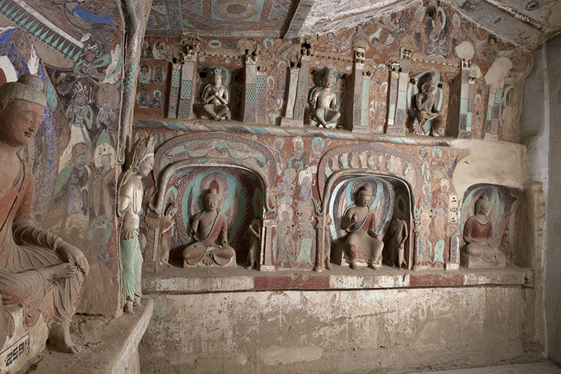 南北壁下层龛内塑佛说法像、倚坐像和禅定像。其中北壁东侧的禅定佛像是莫高窟塑像中的代表作之一。禅定佛头生肉髻,身上穿通肩袈裟,两眉细长,双眼略开,嘴角露出一丝微笑,似乎体味着参禅悟道后的满足和愉悦。此尊塑像表现出民族审美情趣与传统技法纯熟的运用,是敦煌石窟中不可多得的上乘佳作。