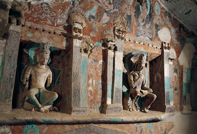 洞窟南北两壁分作上下两层。上层的阙形龛内塑造的是弥勒交脚像和思惟像。在佛教造像中,思惟造型有时是指释迦牟尼成佛前沉思解脱生、老、病、死之法时的形象,有时是指弥勒菩萨在兜率陀天的沉思形象。本窟上层龛中的思惟菩萨像,局部有所损坏,露出了中心所用的一束束芦苇和木垛,从这些破损处让我们从中看出敦煌彩塑的制作过程和所用的材料。敦煌中小型彩塑的制作方法是首先用粗壮的木枝把人的形体框架绑好,然后缠上芦苇(唐代之后多用芨芨草或麦草),再塑泥巴,涂以色彩。塑像用的泥巴一般都要掺和大量的麦草、麻或棉花等纤维和少量的细砂,分别制成粗细不同的泥。塑造时由内到外,用泥由粗到细,分成若干层,层层压紧,收缩干燥。