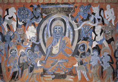北壁东起第二幅是降魔变。佛经中说,释迦修道即将成佛,群魔非常惊恐,魔王波旬便纠集部众向释迦发起进攻,他们挥刀舞剑、施放毒蛇猛兽都不能伤害释迦。魔王波旬又让自己的三个漂亮女儿向释迦佛献媚,想以女色诱惑,佛以神通使魔女变成又丑又老。图中释迦佛端坐中央,神情泰然,周围的群魔面目狰狞恐怖,一个个挥舞着毒蛇兵器,佛前地下是降服的魔王。这幅画构图简炼、人物突出、色彩淳厚,人物动与静、美与丑的对比十分强烈。