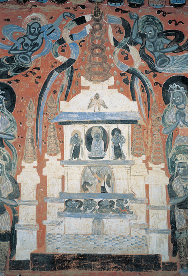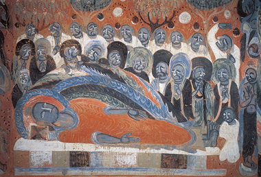 西壁北侧有一铺莫高窟最早的涅槃图。画面描绘了释迦牟尼佛在娑罗双树下安详入灭的场景,众位弟子侍立左右,神情悲痛。根据佛教的描述,佛陀和常人一样必须经受生、老、病、死的生命之苦,但由于他已参透生命的实相,所以可从各种精神烦恼中解脱出来,不再陷入轮回。因此,涅槃是指一种不再陷入任何执着和烦恼的精神状态,并非仅是对佛陀生命结束的形容。这幅图中横卧的释迦佛,既不是犍陀罗的右手支卧状,也不同于后来的右胁而卧,而是受中原影响的半卧式,造型古朴,富有时代特色。