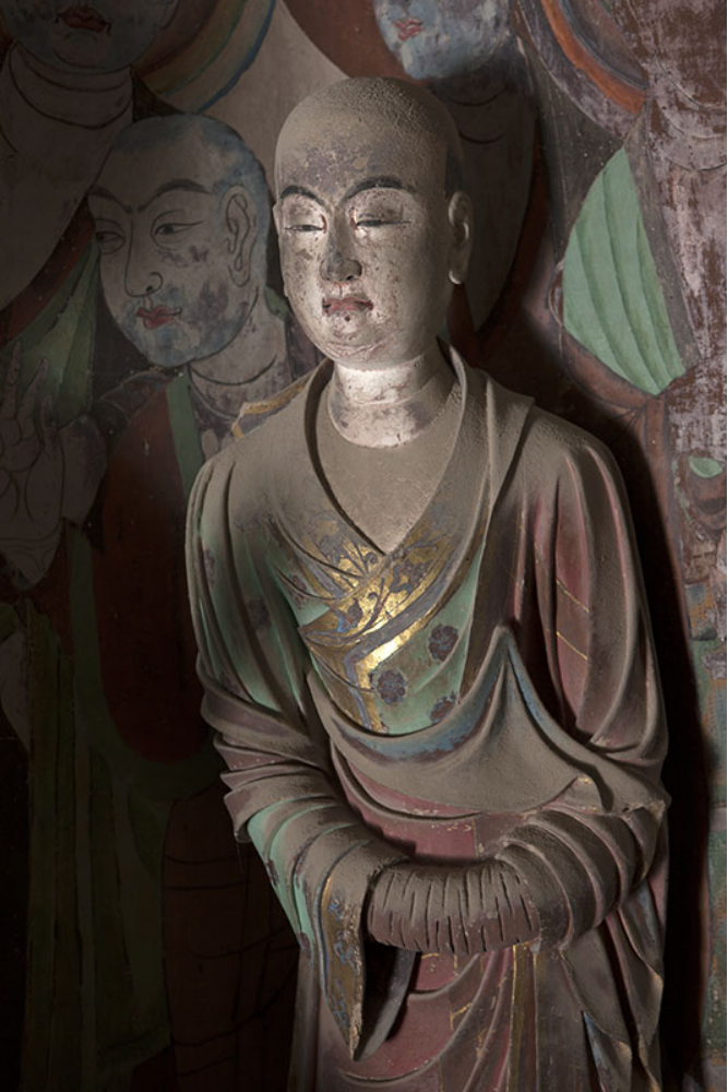 右侧为阿难像。阿难是释迦牟尼佛的堂弟,他19岁皈依佛门,侍佛25年,多闻佛法,长于记忆,被称为“多闻第一”。此身阿难像身躯微斜,两手笼于袖内,昂首侍立,面貌丰润,双目微睁,似在出神聆听。