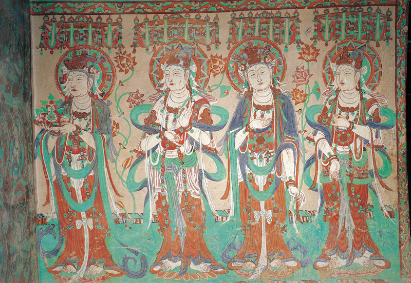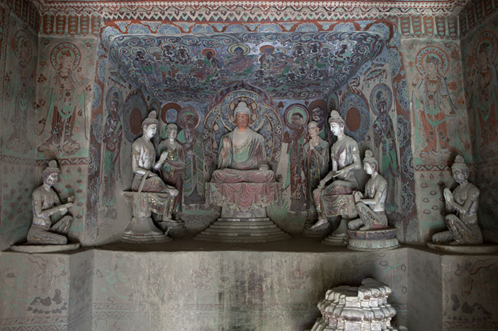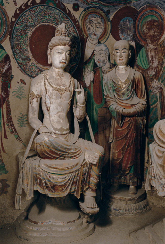 佛龛外侧为三身供养菩萨,体态修长,璎珞长垂,胡跪于莲台,气质端庄典雅,造型严谨细致。其中龛内南侧的一身供养菩萨,在1924年被美国人华尔纳盗走,现存于美国哈佛大学赛克勒博物馆。