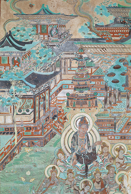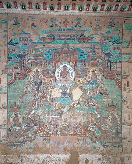 《观无量寿经变》中心位置绘制的是阿弥陀佛和两位胁侍——观音菩萨和大势至菩萨,周围众菩萨簇拥听法。画面上方和左右两侧描绘的是极乐世界的建筑,主殿雄伟高大,侧殿、角楼作为陪衬安置于左右两侧。建筑物自然巧妙地连接、组合,表现出建筑物的立体感和空间感。下方的伎乐天歌舞奏乐,以音乐舞蹈供养阿弥陀佛。古代艺术工匠以中轴为主线左右对称画出了建筑物、说法图、佛、菩萨和乐队。布局井然有序,主次分明。结构高低错落,前呼后应。加上不鼓自鸣的乐器,碧波荡漾的绿水、盛开鲜艳莲花的宝池,使整个画面充实而紧凑、自然而连贯。