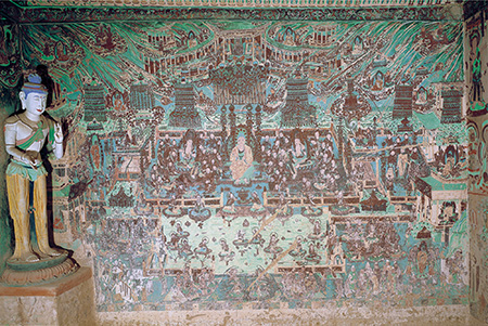 洞窟南壁通壁画阿弥陀经变,主尊阿弥陀佛居中,坐于莲花座上,手结转法轮手印,为圣众说法,两侧画两胁侍菩萨及众供养菩萨。画面上端及两侧画西方浄土世界的建筑,下端画七宝池、八功德水。画面虽已变色,但构图精巧,气势宏伟。